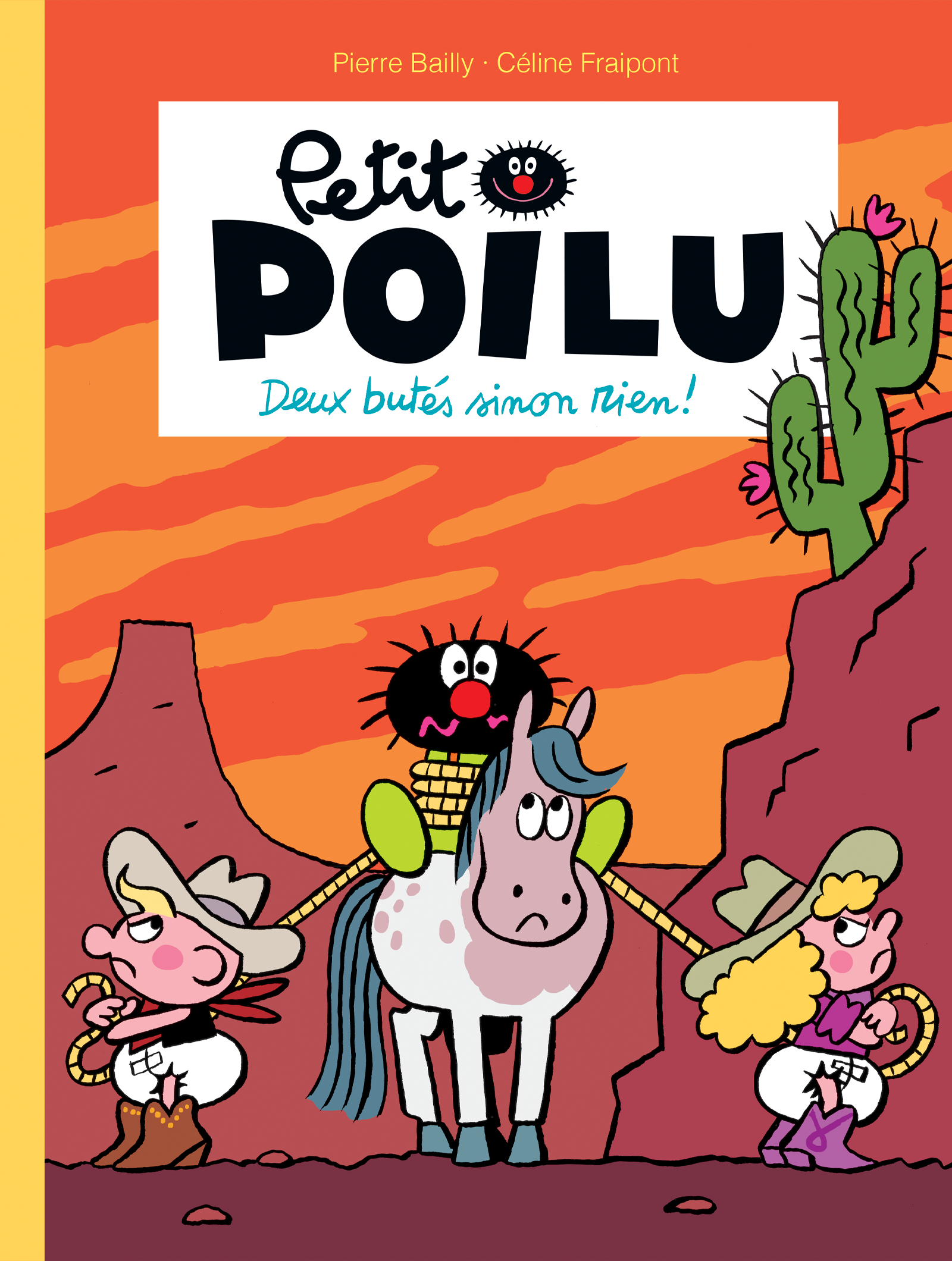 Grâce à la rencontre avec Ding-Dong, un gentil serpent à sonnette se trouvant sur le chemin, Petit Poilu se retrouve parachuté dans les plaines rouges et poussiéreuses du Far West ! Il y rencontre Colorado, un cheval tendre et doux, qui, sous le soleil brûlant, l’emmène galoper dans cet univers d’aventures et de légende. C’est aussi le lieu de vie de deux bébés cow-boys têtus, Tête de Bois et Tête de Mule, qui l’accueillent dans leur ranch avec sympathie et enthousiasme. Les deux acolytes veulent jouer avec Petit Poilu, mais comment jouer avec les deux têtes de mule les plus butées de tout le Far West ? Tête de Bois et Tête de Mule ne veulent rien lâcher et leur esprit buté pourrit les séances de jeux et de partage avec Petit Poilu. Celui-ci tente bien d’imposer ses choix, mais ces deux durs à cuire bornés utilisent des méthodes d’intimidation dignes des plus grands bandits du Far West... Petit Poilu devra faire preuve de courage, de ruse et d’intelligence pour dompter ces deux horribles petits cow-boys têtus…