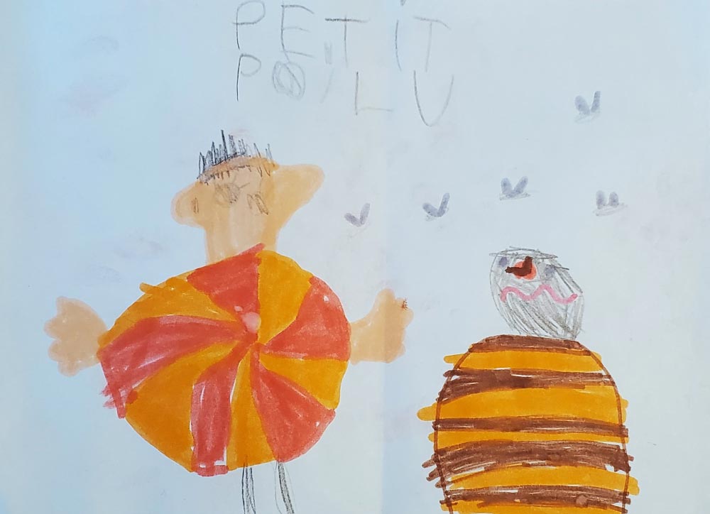 Deux des dessins rélisés par Félix, 6 ans, dont un avec des abeilles pour, qui sait, inspirer les auteurs pour un futur album
